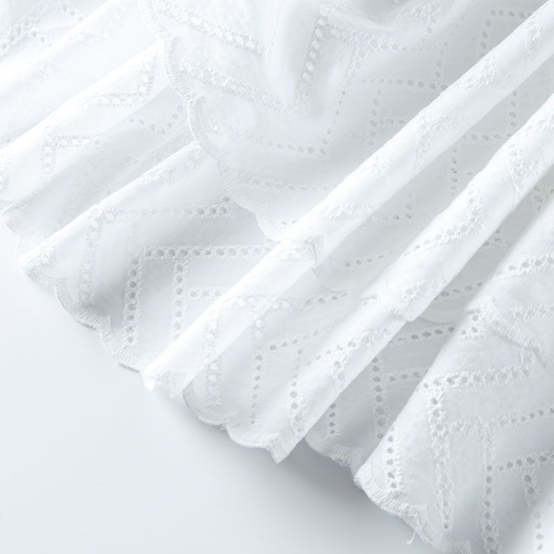 Итальянское шитье на белоснежной хлопковой основе с геометрической, элегантной вышивкой, расположеннной по всему полотну. Ткань мягкая, легкая, пластичная, приятная на ощупь, просвечивает, потребуется подклад. Обе кромки ткани оформлены фигурными фестонами. Идеально подойдет для пошива рубашки, блузы, топа в воланами, туники, платья, сарафана, юбки, шорт.